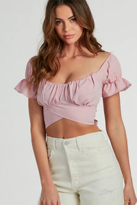Everyone will take notice of how cute you look in this chiffon crop top - perfect for brunch or day dates! Crafted from chiffon fabric, this top features adorable puff short sleeves, a flattering scoop neckline, and a ruched bust for added charm. The cropped hem and tie-back straps add a stylish touch. Complete the look in trendy denim jeans and heels.