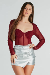 Look stunning in this ultra-pretty corset bodysuit! Sheer-fitted long sleeves and the sweetheart neckline with a built-in padded underwire bust are both adorned with faux pearls for a romantic and luxe finish while the sheer mesh bodice with flexible boning offers a snatched look. The bodysuit features a form-hugging fit, thong bottom, and snap-button closures. Style with sleek faux leather bottoms for a wine bar!