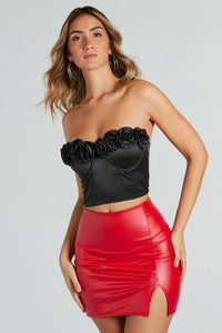 Create a dreamy aesthetic vibe in this satin bustier! Showcasing a gorgeous rosette flower trim strapless neckline, this top features a built-in padded and underwire bust, flexible boning for a snatched look, and a fitted crop hem. Complete the look in boyfriend jeans for a wine bar or party!