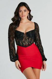 Show off your charming style with this sheer lace corset top! This stunning top features sheer lace peasant long sleeves, a wired V-neckline and underwire bust for a gorgeous silhouette, flexible boning for a structured fit, and a sheer lace bodice and cropped hem. Complete the look in flare pants for a chic dinner date outfit!