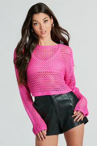 Look flirty and fabulous in this sheer crop sweater! The sheer knit design gives a delicate, airy look that will be sure to turn heads, while the bell long sleeves, crew neckline, and cropped hem make it ultra-flattering. Complete the look in sleek shorts.