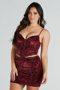 Captivate hearts and turn heads in this flocked velvet bustier! From parties to dates, look and feel your best in this bustier featuring a sweetheart neckline, adjustable spaghetti straps, and a built-in underwire bust for support. It's detailed with hidden front hook and eye fasteners, flexible boning, and a cropped hem. Complete the look with the matching bottoms.
