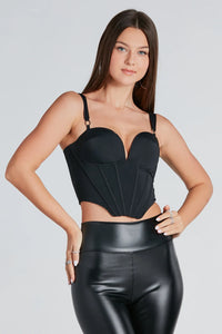Have your 'fit be a little sweet and sultry with this on-trend cropped bustier top! It features a sleeveless sweetheart neckline with a structured and padded bust for support, adjustable spaghetti straps for a customized fit, a chic corset-designed bodice with flexible boning, an angled cropped hem, and a snatched, form-hugging fit. Style this bustier with a faux leather mini skirt and clear heels for a girl's night out.