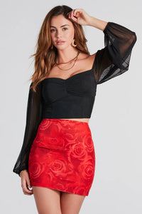 The perfect mesh crop top for date nights, parties, or just feeling cute! Elevate your favorite bottoms with this sweet and sassy crop top featuring an off-the-shoulder neckline, sheer peasant long sleeves, a ruched and padded bust, and a fitted crop hem. Complete the look in a fitted midi skirt and heels.