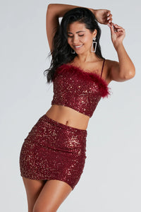 Show off your #ootd with this dazzling sequin crop top! Crafted from sequin-embellished knit fabric, it features a square neckline, adjustable spaghetti straps, and a cropped hem. Make a statement with its marabou trim for a night out. Complete the look with the matching skirt.