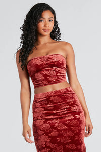 With this strapless crop top, you won't be asking yourself if they love you not! It features a mini ruched bust seam, a cropped hem, and a sultry velvet floral burnout pattern with a sewn-in knit lining. Complete the look with the matching bottoms for a date!