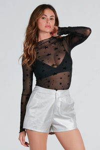 Leave them starstruck by your trendy style in this velvet flocked mesh crop top! It features a mock neckline, long fitted sleeves, a fitted cropped hem, lettuce edge hems, and a velvet flocked star pattern on the stretchy sheer mesh fabric. Style this top with a lacy bralette and faux leather pants for a concert.