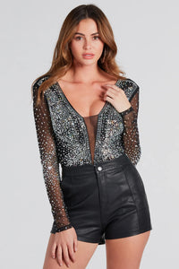 Turn heads and own the night in this rhinestone mesh bodysuit! Designed with sheer fitted long sleeves, a plunging V-neckline, form-hugging fit, gorgeous rhinestone embellishments, and a thong bottom with snap-button closures, this stunning bodysuit adds a bold allure to any outfit. Complete the look in chic trousers to play up your style!
