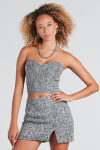 This sophisticated tweed corset top is perfect for making a chic statement! With a flattering tailored fit, the corset features a strapless sweetheart neckline and a cropped hem. The corset is crafted from tweed fabric with a sewn-in woven lining. Complete the look with the matching trench coat and mini skirt.