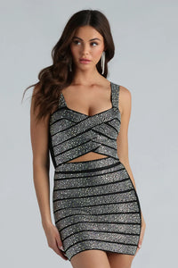 This amped-up glam rhinestone bandage crop top will have you shimmering with glitz all night! It features a sleeveless sweetheart neckline with tank shoulder straps, a front design of iridescent rhinestone embellishments for that gorgeous multi-hue sparkle, and a fitted cropped hem. The bandage knit fabric features a front criss-cross seam design and offers a sculpted and snatched look. Style with the matching mini skirt and strappy stilettos!