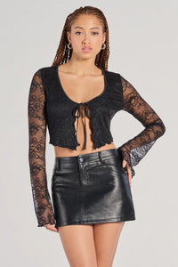 Romance comes naturally in this lace crop top boasting a flirty tie-front closure and sheer long sleeves with flared cuffs for extra drama. Pair with a mini skirt.