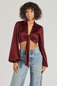 Channel sleek vibes in this satin tie-front crop top. With a collared V-neck, tie-front, and long bishop sleeves, it's your go-to for effortless style.