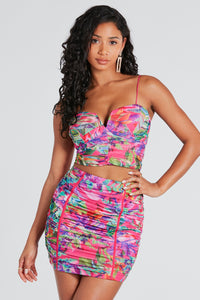 Pack your bags with this stunning tropical mesh bustier on your way to the Maldives! Enjoy fun in the sun in this sultry top featuring a sleeveless wired V-notch neckline, sleek bungee spaghetti straps, a padded bust, and flattering ruched seams and crop hem. Style with the matching skirt and duster to complete the look!