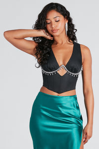 Capture the attention in this sleeveless crop top perfect for a glam evening out! Designed with captivating rhinestone fringe along the underwire bust, the top features a sleek V-neckline, a mini bust cutout, flexible boning inserts, and is crafted from lined woven fabric. Complete the look in high-rise denim jeans and mules!