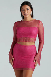 Everyone will want your style secrets after seeing you in this glitzy rhinestone crop top! It features a crew neckline, long fitted sleeves, a fitted cropped hem, and is composed of a sultry sheer fishnet fabric with all-over mini rhinestone embellishments. Style over a lacy bralette with faux leather pants for a night out.