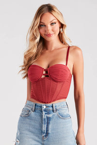 Watch everyone give you sweet affection for looking so stunning in this mesh crop bustier perfect for styling with your favorite denim! It features a sleeveless sweetheart neck with front lattice straps, adjustable spaghetti straps, a ruched built-in padded bust with underwire, a sheer bodice with flexible boning, and back hook-eye closures. Complete the look in flare jeans.