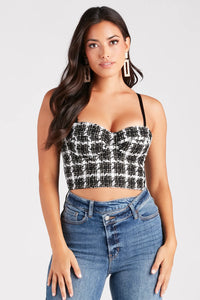 Become an instant 90s-inspired classic in this tweed bustier to posh up your vibe! Featuring a sleeveless sweetheart neckline with non-slip grip lining, adjustable and detachable spaghetti straps so you style it strapless, a built-in padded underwire bust, a cropped hem with non-slip grip lining, and a stretchy knit back. Complete the look in a chic mini skirt and heels for a date night or party!