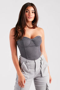 Keep your look modern and posh in this pinstripe corset top! Featuring a strapless neckline with non-slip grip lining, flexible boning inserts along the bodice, a fitted crop hem, and multiple back hook and eye closures. The corset top is designed with a chic pinstripe print on lined smooth woven fabric. Complete the look with chic wide-leg pants for a wine bar!