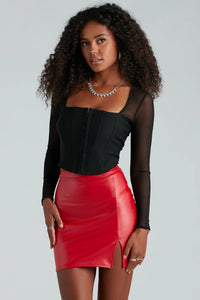 Strut with confidence babe in this chic corset top for a night out with the ladies! It features sheer mesh fitted long sleeves and back panel, a square neckline, a classic corset bodice with flexible boning, and hidden front hook and eye closures along the cropped hem. Complete the look in a faux leather mini skirt and heels.