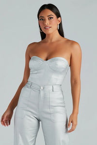 Put on a show in this trendy metallic corset top! It features a strapless sweetheart neckline, a padded bust, and a fitted cropped hem. Complete the look in high-rise trousers for a party!