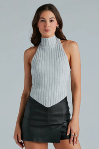 For all the cozy girlies who want to be cute! This sleeveless sweater top is the best of both worlds. Featuring a halter mock neckline, a flirty open back with a lace-up design, and a curved cropped hem on super soft rib knit fabric. Complete the look in best-selling boyfriend jeans and heels for a dinner downtown!