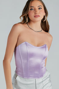 Arrive on the scene sleek and smooth in this satin bustier to elevate your fashion game! It features a strapless curved neckline, a hidden side zipper closure, flexible boning inserts for a structured fit, and a cropped hem. Style with high-rise skinny jeans to complete the look for a wine night!