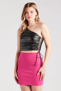 This faux leather top captures your good side for every post on social! It features a sleeveless one-shoulder neckline, a tank shoulder strap, a side ruched seam, and lace-up design, and a cropped hem. The top is composed of a faux leather fabric with a sewn-in knit lining. Complete the look in denim shorts for a trendy night out.