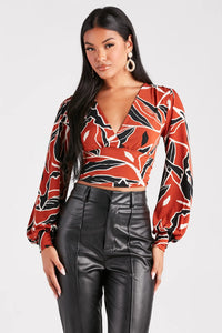 You'll love all the pics you take in this abstract print crop top that gives your outfit the perfect statement piece! It features flowy long sleeves with banded cuffs, a surplice V-neckline, and a banded crop hem on smooth knit fabric. Complete the look in sleek faux leather pants for an art show and dinner!