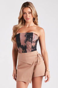 X marks the spot that will lead you to this stylish bustier! It features a strapless neckline, flexible boning inserts for a structured fit, a back zipper and hook-eye closure, and a fitted hem on abstract printed mesh-lined fabric. Complete the look in a mini skort for a night of dinner and drinks!