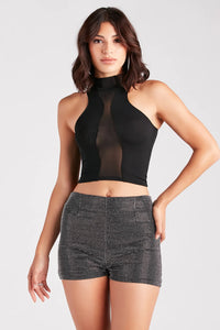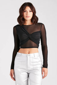 Turn heads with your stunning looks in this sheer mesh crop top! It features a crew neckline, long fitted sleeves, a twist-front contrast design, ruched side seams, and a fitted cropped hem. The completely sheer mesh fabric offers plenty of stretch. Style over a lacy bralette with a faux leather mini skirt!