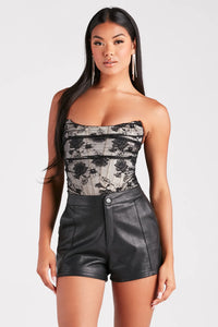 This sultry sheer lace corset bodysuit was made for a romantic date night with your special someone. One piece top features a strapless square neckline with an angled design, flexible boning inserts to provide structure, a sheer floral lace pleated overlay at the corset-style knit bodice, a thong-cut bottom with a dual snap button closure, and a form-hugging fit. The knit fabric offers a moderate stretch. Complete your look with faux leather pants.