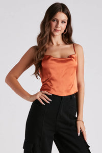 Radiate romance this spring for your next fling! Show some skin in this satin crop top featuring a sleeveless cowl neckline, adjustable spaghetti straps, and a tie-back closure on double-lined satin fabric with no stretch. Style with best-selling skinny pants to complete the look!