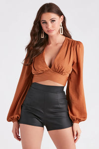 A stunning satin crop top for your next dinner and dancing plans! It features peasant long sleeves, a plunge V-neckline, and a flirty tie-back cropped hem design on silky satin woven fabric with no stretch. Complete the look in hot faux leather shorts.