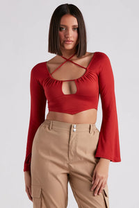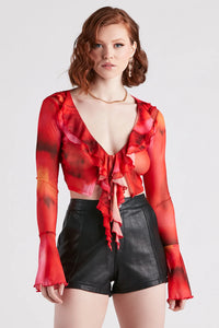Bring the heat with a sultry top that will radiate summer vibes! It features a V-neckline with a ruffled trim, a tie-front design, long fitted sleeves with cute flared hems, and a cropped, form-hugging fit. The red top has a sheer mesh fabric with an eye-catching swirl print pattern. The black top has a solid sheer mesh fabric. Style with high-rise shorts and sandals.