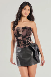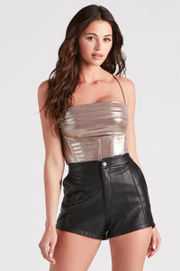 You're just a girl on the town looking so sleek in this faux leather corset top! It features a strapless neckline with non-slip grip lining, flexible boning inserts, and a curved crop hem on lined faux leather fabric with minimal stretch. Style with new best-selling jeans to complete the look!