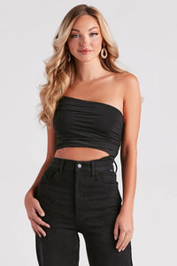 This adorable strapless crop top is a flirty find to level up your everyday basics. Designed with a stretchy double-lined smooth knit fabric, it features a strapless neckline with a trendy V-wired insert, front ruching, and a form-hugging fit. Style with high waist jeans and sneakers for casual weekend plans.