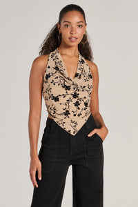 Bring the bold romance in this chic flocked floral print top featuring a halter cowl neckline, an alluring open back with a lower tie-back design, and an asymmetric hanky hem. Style with trouser pants and heels.