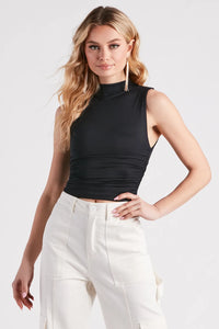 This simple and chic mock neck top will give you that smooth and sleek silhouette you love! It features a sleeveless bodice, a mock neckline, tank shoulder straps, a mid-length hem with ruched side seams, and a form-hugging fit. The double-lined stretchy knit fabric offers a seamless design and has an ultra-soft buttery feel. Style with high waist bottoms and strappy mules.
