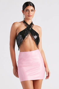 Get ready to dance all night and give off disco babe energy in this trendy sequin top! It features a sleeveless bodice with cross-front halter straps, a sultry ultra-cropped front design with dainty beaded fringe detailing, a bold open back with lower back lace-up straps, and all-over sequin embroidery for a stunning shine. Style with high-rise denim and clear mules!