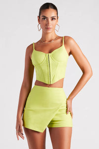 Show off a flirtatious style in this adorable linen corset top, perfect for afternoon wine tasting or evening cocktails! It features a sleeveless sweetheart neckline, adjustable spaghetti straps, a built-in padded bust with underwire, a hidden front hook and eye closures, flexible boning, and a cropped hem. Complete the look with the matching skort and espadrille sandals!