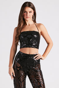 This shimmery sequin crop top will have you radiating glitzy vibes! It features a square neckline, halter spaghetti straps, a fitted, cropped hem, and sequin embroidery in a stunning scroll design. Style with the matching flare pants and clear heels for your next girl's night out!