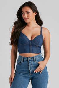Step out for GNO in a stunning corset that stuns! The corset features a sleeveless sweetheart neckline, adjustable shoulder straps, padded demi-cups, flexible boning, and a hook and eye front closure. The corset is composed of a lined denim fabric that offers a form hugging fit with a moderate stretch. Complete look with a wrap skirt.