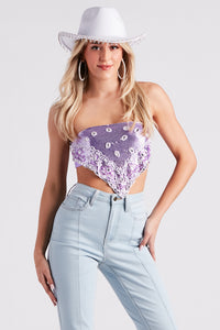 Strut into festival season in the trendiest 'fit! Style up this chainmail bandana tube top for a western-glam vibe. It features a strapless straight-across neckline with an angled cropped hem, beaded and gemstone accents on the chainmail material, and a smocked back with a zipper closure. Complete your look with frayed jeans and a chain belt!