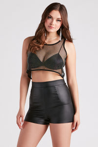 You won't have to fish for compliments in this fishnet tank top...they'll come naturally from everyone who sees you! Flaunt your edgy style featuring a sleeveless crew neck, a cropped hem, and all-over rhinestone embellishments on sheer fishnet fabric. Complete the look in pasties and denim shorts for a festival or concert!