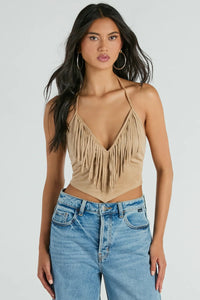 Festive Icon V-Neck Fringe Halter Faux Suede Crop Top