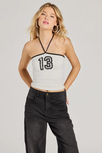 Showcase your lucky number in this strapless tube top perfect for those off-duty days! This bold top features a striking contrast trim strapless neckline with a playful tie, and a statement-making thirteen graphic, and a cropped hem. Complete the look in jean shorts and sandals.