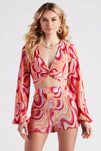 Create a fab retro look for spring break with this trendy printed crop top! It features a deep V-neckline with a twist-front design, long peasant sleeves with cinched hems, a fitted cropped hem, and an all-over eye-catching swirl print pattern. The lightweight plisse woven fabric includes a front knit lining. Style with the matching shorts and clear mules.