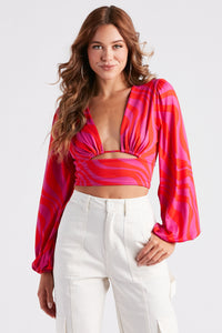 This trendy crop top will give off major vacay vibes! It features a plunging neckline with a small cutout under the bust, long peasant sleeves, an open lower back with a tie-back design, a fitted, cropped hem, and a retro swirl print pattern. The soft brushed knit fabric offers plenty of stretch. Style with high-rise denim and strappy sandals.