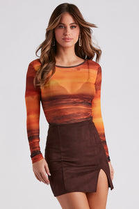 You'll be a total undercover cutie in this sultry sheer crop top! It features a crew neckline, long fitted sleeves, a fitted, cropped hem, and an all-over camouflage print on the airy sheer mesh fabric. Style over a bralette with a faux leather mini skirt for a night out.