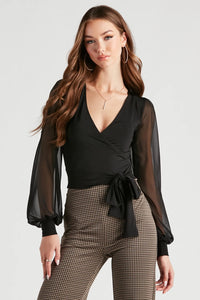 Time after time, you'll be reaching for this dressy crop top from date nights to parties and more! The top features chiffon bishop sleeves, a plunge V-neckline, and a surplice bodice with a tie-front hem. Complete the look in trouser pants.